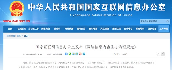 2020-03-02 15:32:29閱讀()國家互聯(lián)網(wǎng)信息辦公室由國家互聯(lián)網(wǎng)信息辦公室發(fā)布的《網(wǎng)絡(luò)信息內(nèi)容生態(tài)治理規(guī)定》(以下簡稱《規(guī)定》)已于昨日(3月1日)起施行,旨在營造良好網(wǎng)絡(luò)生態(tài),保障公民、法人和其他組織的合法權(quán)益,維護(hù)國家安全和公共利益。
