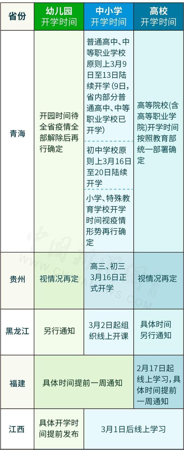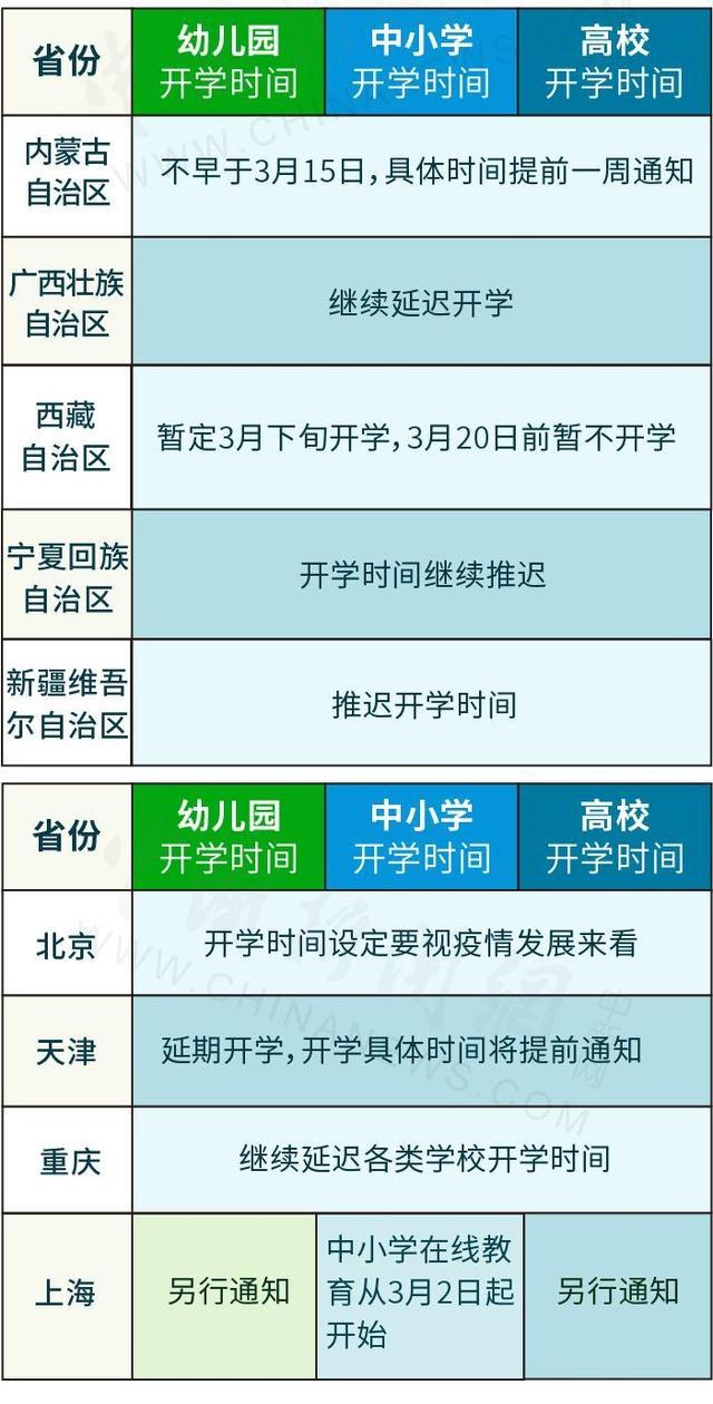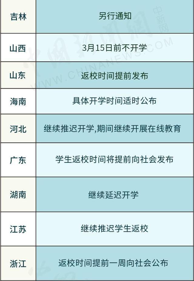 2020-03-10 12:52:07閱讀()中國新聞網(wǎng)一圖看明白!31省份開學時間一覽表,隨著疫情往好的方向發(fā)展,截止2020年3月10日已經(jīng)有幾個省、自治區(qū)相繼清零,各中小學高校也開始做好開學準備,下圖來自中國新聞網(wǎng)匯總的“31省份開學時間一覽表”