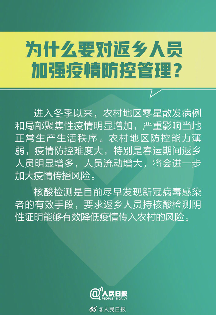 為嚴格落實內防反彈的防控策略,對返鄉(xiāng)人員加強疫情防控管理十分必要。核酸檢測是目前盡早發(fā)現(xiàn)新冠病毒感染者的有效手段,要求返鄉(xiāng)人員持核酸檢測陰性證明能夠有效降低疫情傳入農村的風險,保障大家度過一個健康、平安的春節(jié)。
