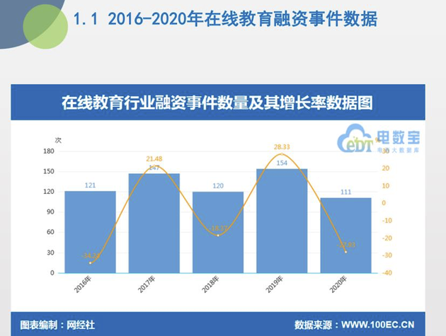 2020 年,資本對于在線教育的狂熱程度,可以從一組數(shù)據(jù)中看出端倪。根據(jù)網(wǎng)經(jīng)社電子商務(wù)研究中心發(fā)布的《2020 年度中國在線教育投融資數(shù)據(jù)報告》(以下稱 “報告”),2020 年中國在線教育領(lǐng)域共發(fā)生 111 起融資,同比下降 27.93%。