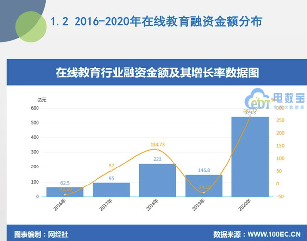但是,在線教育領(lǐng)域的融資總額卻達(dá)到了歷史高位,融資總額超過 539.3 億元,同比增長 267.37%。這一總額比 2016 年到 2019 年四年的融資總額都要多。