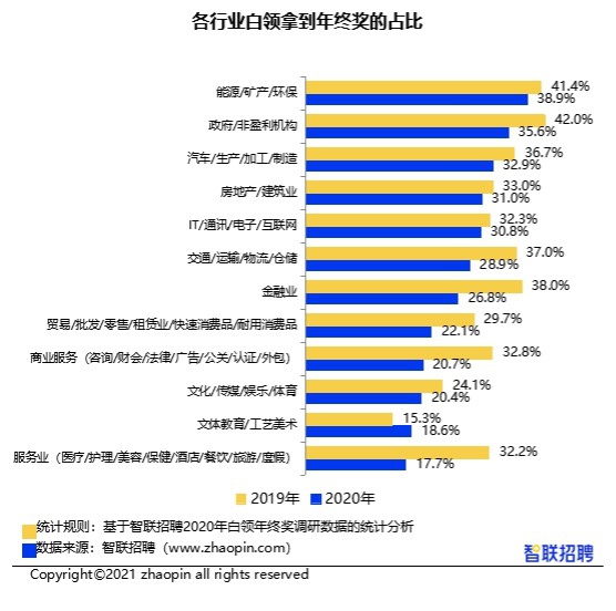 而智聯(lián)招聘提供的《2020 年白領(lǐng)滿意度指數(shù)調(diào)研報告》則顯示,2019 年,文體教育 / 工藝美術(shù)行業(yè)拿到年終獎的白領(lǐng)比例為 15.3%,在 2020 年這一比例升至 18.6%,是唯一實(shí)現(xiàn)正增長的行業(yè)。