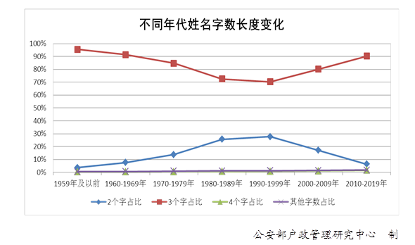 目前,我國除部分少數(shù)民族外,大部分人的名字多為二字(單姓單名)、三字(單姓雙名或復(fù)姓單名)或四字(復(fù)姓雙名),超出四字的比較少見。從不同年代看,三字姓名一直占據(jù)主流。特別是上世紀六十年代以前,宗族、家族姓名文化深入人心,取名字往往帶上標識輩分的字,因此二字姓名較少。改革開放后,現(xiàn)代文化思潮不斷影響著取名字的方式,輩分觀念逐漸被淡化,人們?nèi)∶非蠛啙嵑糜?,二字姓名人?shù)占比由上世紀六十年代的7.6%增長到九十年代的27.6%。21世紀以來,隨著人口規(guī)??焖僭鲩L和人口流動日益頻繁,重名現(xiàn)象多了起來,為了降低重名率,三字姓名又逐漸增多,目前,三字姓名占比超過90%,二字姓名占比減至6.3%。四字及其他字數(shù)姓名雖使用人數(shù)較少,但一直保持增長態(tài)勢,分別由上世紀五十年代的0.3%、0.4%提高到目前的1.6%和1.7%。