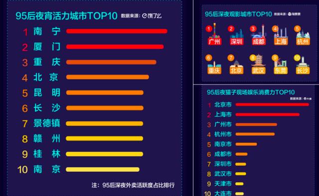 橫向比較95后宵夜活力城市TOP10、95后深夜觀影城市TOP10、95后夜貓子現(xiàn)場(chǎng)娛樂消費(fèi)力TOP10,入圍城市均以南方城市為主。廣州、上海、杭州、成都、深圳四地95后夜貓子在多個(gè)文化消費(fèi)榜單中處于領(lǐng)先位置,北京是唯一全部入圍的北方城市。