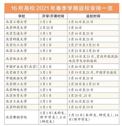 2021-02-18 11:03:33閱讀()北京日報對于在京高校大學(xué)生而言,即將到來的2021年春季學(xué)期,“如期開學(xué)、延遲返校”將成為潮流。記者近日從官方渠道了解到,北京師范大學(xué)、北京交通大學(xué)、北京科技大學(xué)、北京化工大學(xué)等16所在京高校均發(fā)布最新通知,新學(xué)期在原計劃的開學(xué)之日以線上教學(xué)方式開課,時間大多集中于3月1日;學(xué)生返校日期則延后至3月中下旬。