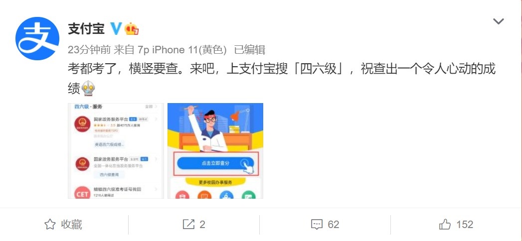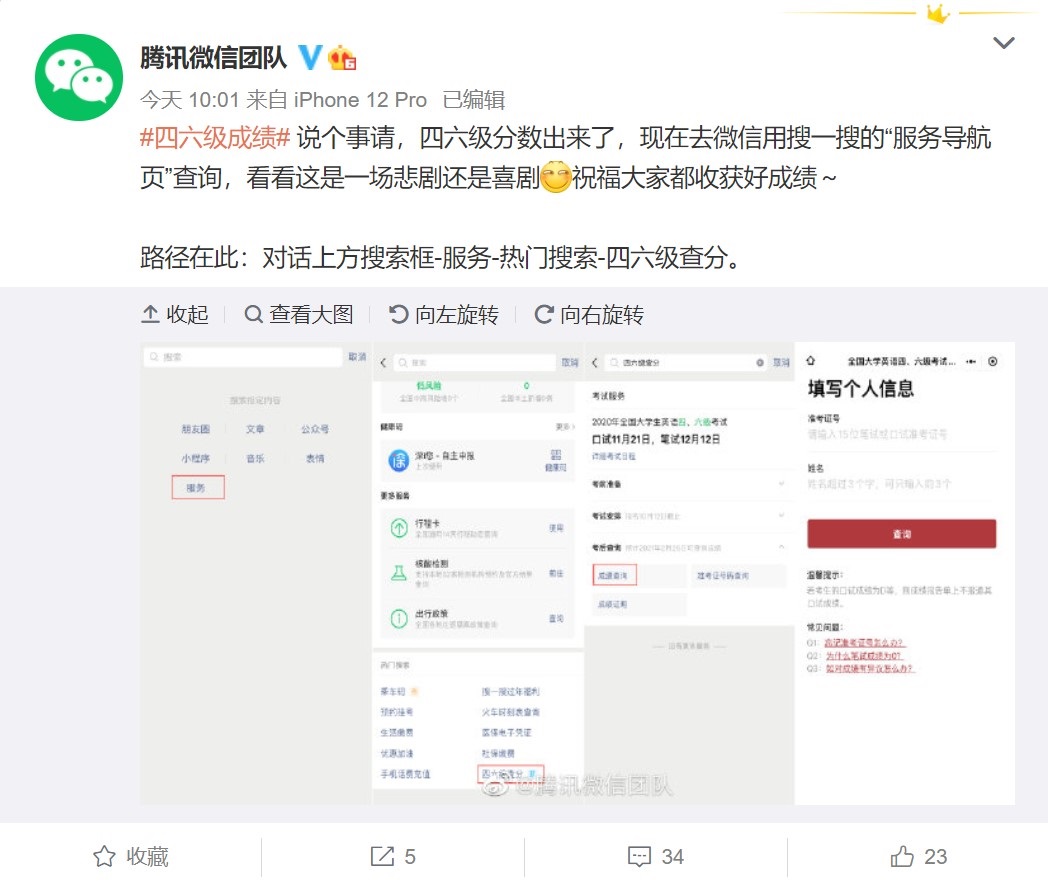 今日午間,@支付寶 微博發(fā)文稱,用戶可通過支付寶搜索 “四六級”查分。26日上午,微信也發(fā)布消息稱,微信搜一搜聯(lián)合國家政務(wù)服務(wù)平臺為廣大考生提供四六級成績查詢服務(wù)。屆時,廣大考生可通過微信搜一搜進行四六級查分,具體路徑為:對話上方搜索框 - 服務(wù) - 熱門搜索 - 四六級查分。
