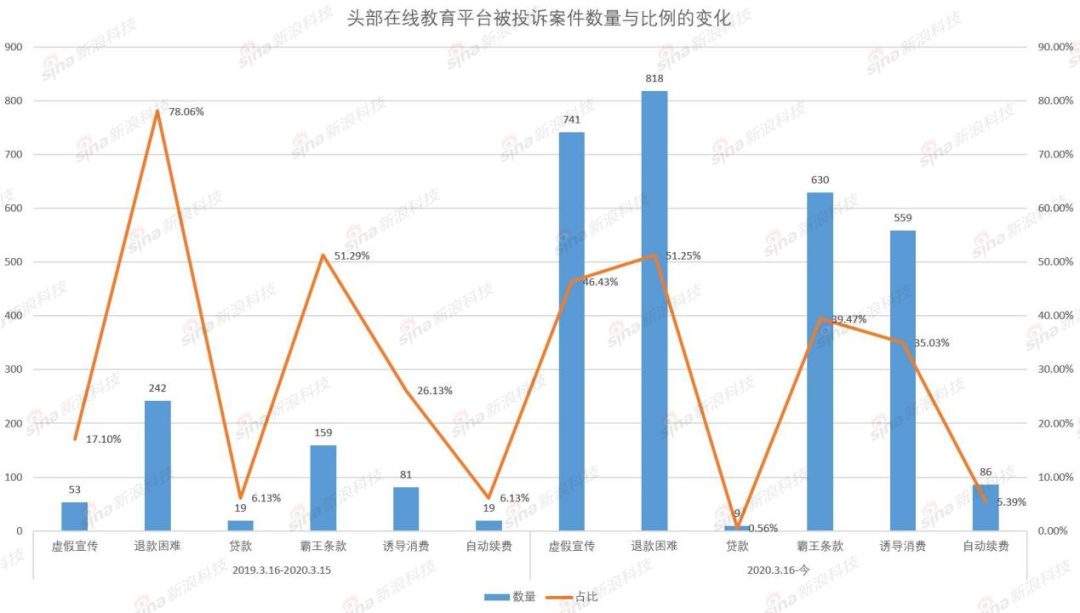 消費(fèi)者服務(wù)平臺(tái)黑貓獲取的數(shù)據(jù)顯示,在教培領(lǐng)域的5家頭部平臺(tái)(好未來、作業(yè)幫、猿輔導(dǎo)、跟誰學(xué)、VIPKID)中,從2019年3月16日到2020年3月15日產(chǎn)生的投訴總量為310起,而2020年3月16日至今則為1596起,增長了414.84%。