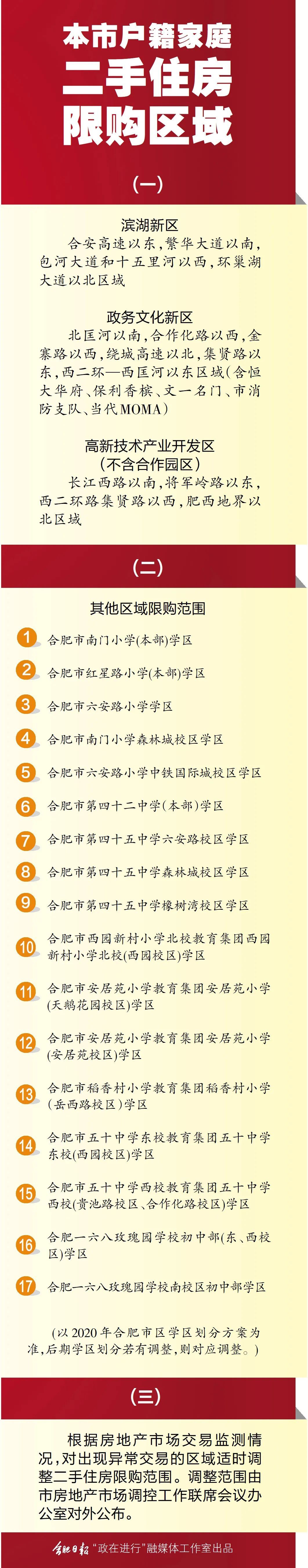為精準(zhǔn)打擊部分區(qū)域二手住房和學(xué)區(qū)房炒作行為,在嚴(yán)格執(zhí)行《關(guān)于進(jìn)一步促進(jìn)我市房地產(chǎn)市場平穩(wěn)健康發(fā)展的若干意見的通知》(合政辦〔2016〕43號)的基礎(chǔ)上,進(jìn)一步收緊我市部分區(qū)域二手住房限購政策,即暫停市區(qū)范圍內(nèi)擁有2套及以上住房的本市戶籍居民家庭在濱湖新區(qū)、政務(wù)文化新區(qū)、高新技術(shù)產(chǎn)業(yè)開發(fā)區(qū)和其他區(qū)域指定學(xué)校的學(xué)區(qū)范圍內(nèi)購買二手住房。其中,學(xué)區(qū)范圍以2020年教育主管部門學(xué)區(qū)劃分方案為準(zhǔn),后期學(xué)區(qū)劃分若有調(diào)整,則限購范圍對應(yīng)調(diào)整。