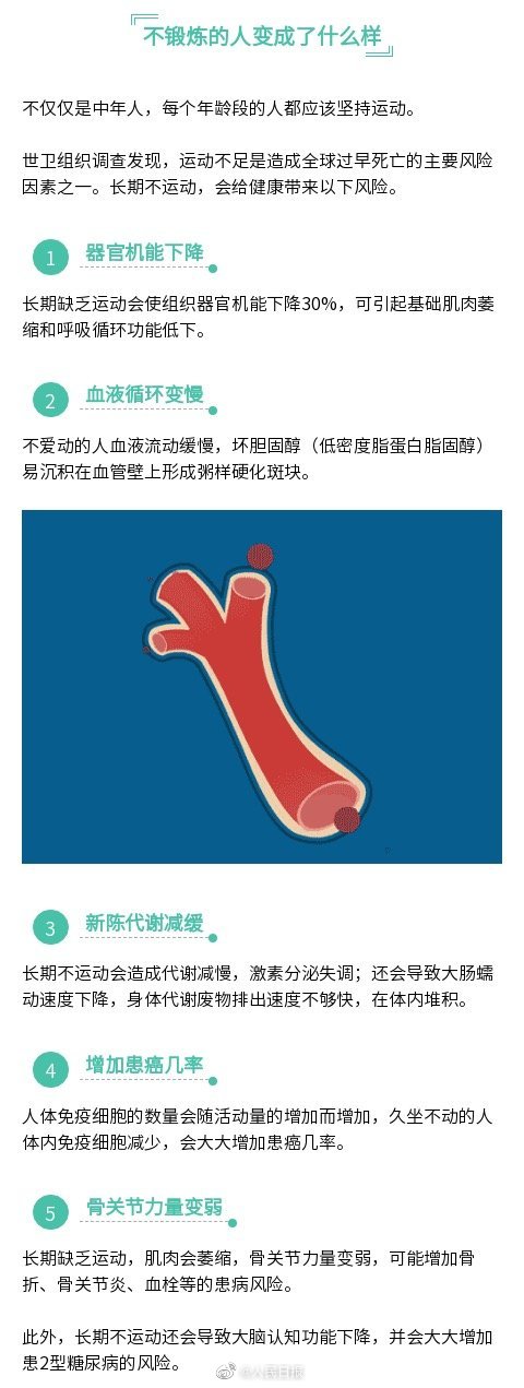 世衛(wèi)組織調(diào)查發(fā)現(xiàn),運(yùn)動(dòng)不足是造成全球過(guò)早死亡的主要風(fēng)險(xiǎn)因素之一。長(zhǎng)期不運(yùn)動(dòng),會(huì)給健康帶來(lái)這些風(fēng)險(xiǎn):器官機(jī)能下降、血液循環(huán)變慢、新陳代謝變慢……結(jié)合國(guó)家體育總局發(fā)布的《全民健身指南》,為你總結(jié)一份“運(yùn)動(dòng)指導(dǎo)”,讓你有計(jì)劃地動(dòng)起來(lái)。