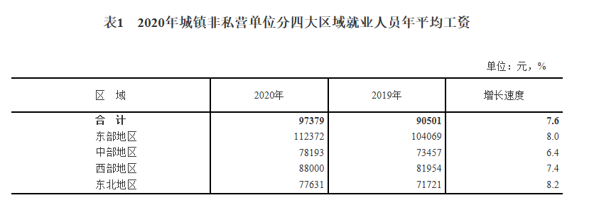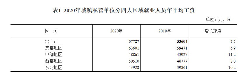 城鎮(zhèn)私營(yíng)單位就業(yè)人員年平均工資由高到低依次是東部、西部、中部和東北地區(qū),分別為63601元、50510元、48861元和43928元,比上年分別增長(zhǎng)6.9%、8.0%、11.2%和10.2%。
