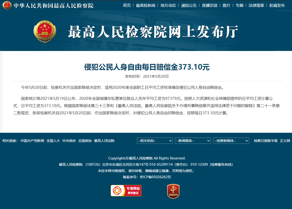 2021-05-20 15:13:02閱讀()最高人民檢察院侵犯公民人身自由每日賠償金373.10元