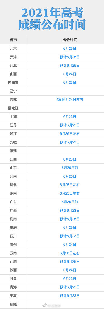 根據(jù)各省份此前公布的時間,6月23日起各地將陸續(xù)公布高考成績,查分時間主要集中在23至26日。