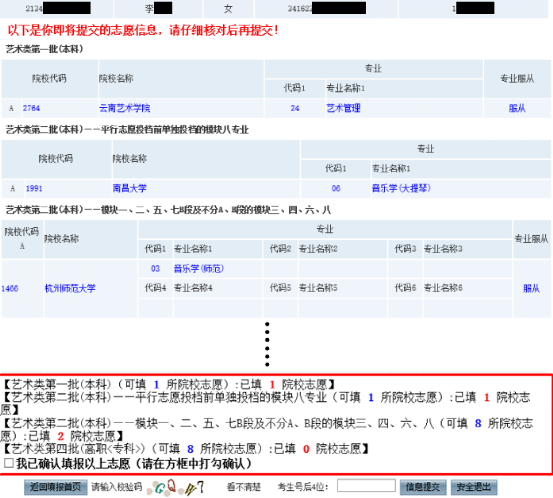 請(qǐng)考生務(wù)必再次仔細(xì)核對(duì)自己的信息,確認(rèn)無(wú)誤后輸入校驗(yàn)碼并點(diǎn)擊“信息提交”按鈕提交志愿信息,信息一旦提交將無(wú)法重填或修改,請(qǐng)慎重操作。若希望重新填報(bào)志愿,切勿點(diǎn)擊“信息提交”,請(qǐng)點(diǎn)擊“返回填報(bào)首頁(yè)”按鈕返回首頁(yè)并重新填報(bào)。