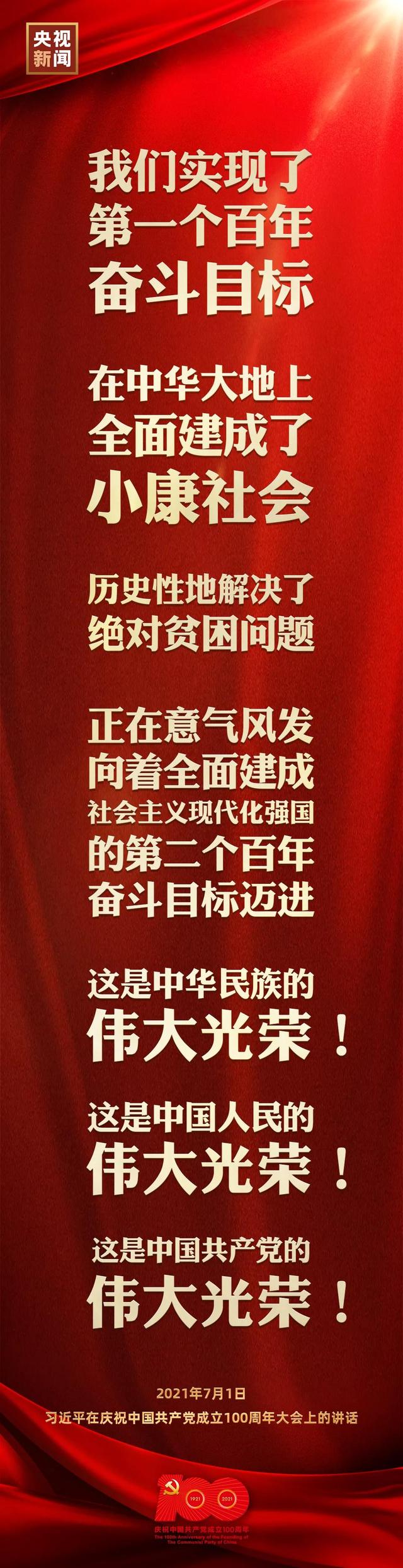 習(xí)近平代表黨和人民莊嚴(yán)宣告,經(jīng)過全黨全國各族人民持續(xù)奮斗,我們實現(xiàn)了第一個百年奮斗目標(biāo),在中華大地上全面建成了小康社會,歷史性地解決了絕對貧困問題,正在意氣風(fēng)發(fā)向著全面建成社會主義現(xiàn)代化強(qiáng)國的第二個百年奮斗目標(biāo)邁進(jìn)。這是中華民族的偉大光榮!這是中國人民的偉大光榮!這是中國共產(chǎn)黨的偉大光榮!