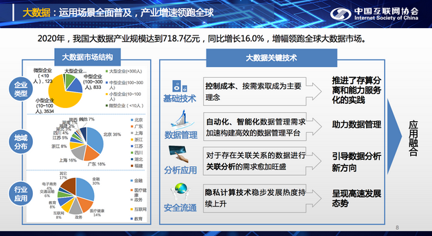 報告顯示,2020年我國大數(shù)據(jù)產(chǎn)業(yè)規(guī)模達到718.7億元,同比增長16.0%,增幅領(lǐng)跑全球大數(shù)據(jù)市場。其中大數(shù)據(jù)市場結(jié)構(gòu)方面,大型企業(yè)(>300人)共有523家,中型企業(yè)(100~300人)共833家,小型企業(yè)(10~100人)共有3534家,微型企業(yè)(<10人)有123家。