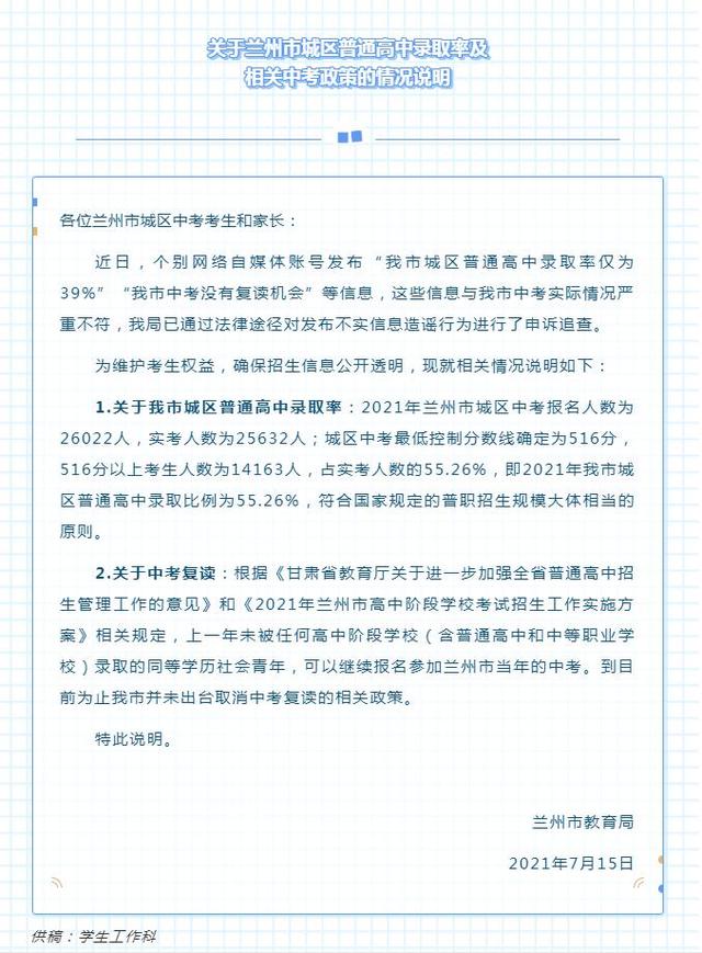 2021-07-16 11:16:23閱讀()蘭州市教育局7月16日電 蘭州市教育局15日在官方微信公眾號上發(fā)布《關(guān)于蘭州市城區(qū)普通高中錄取率及相關(guān)中考政策的情況說明》稱,近日,個別網(wǎng)絡(luò)自媒體賬號發(fā)布“蘭州市城區(qū)普通高中錄取率僅為39%”“蘭州市中考沒有復(fù)讀機會”等信息,這些信息與蘭州市中考實際情況嚴(yán)重不符,蘭州市教育局已通過法律途徑對發(fā)布不實信息造謠行為進行了申訴追查。