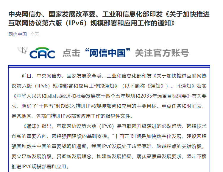 《關(guān)于加快推進(jìn)互聯(lián)網(wǎng)協(xié)議第六版(IPv6)規(guī)模部署和應(yīng)用工作的通知》原文: