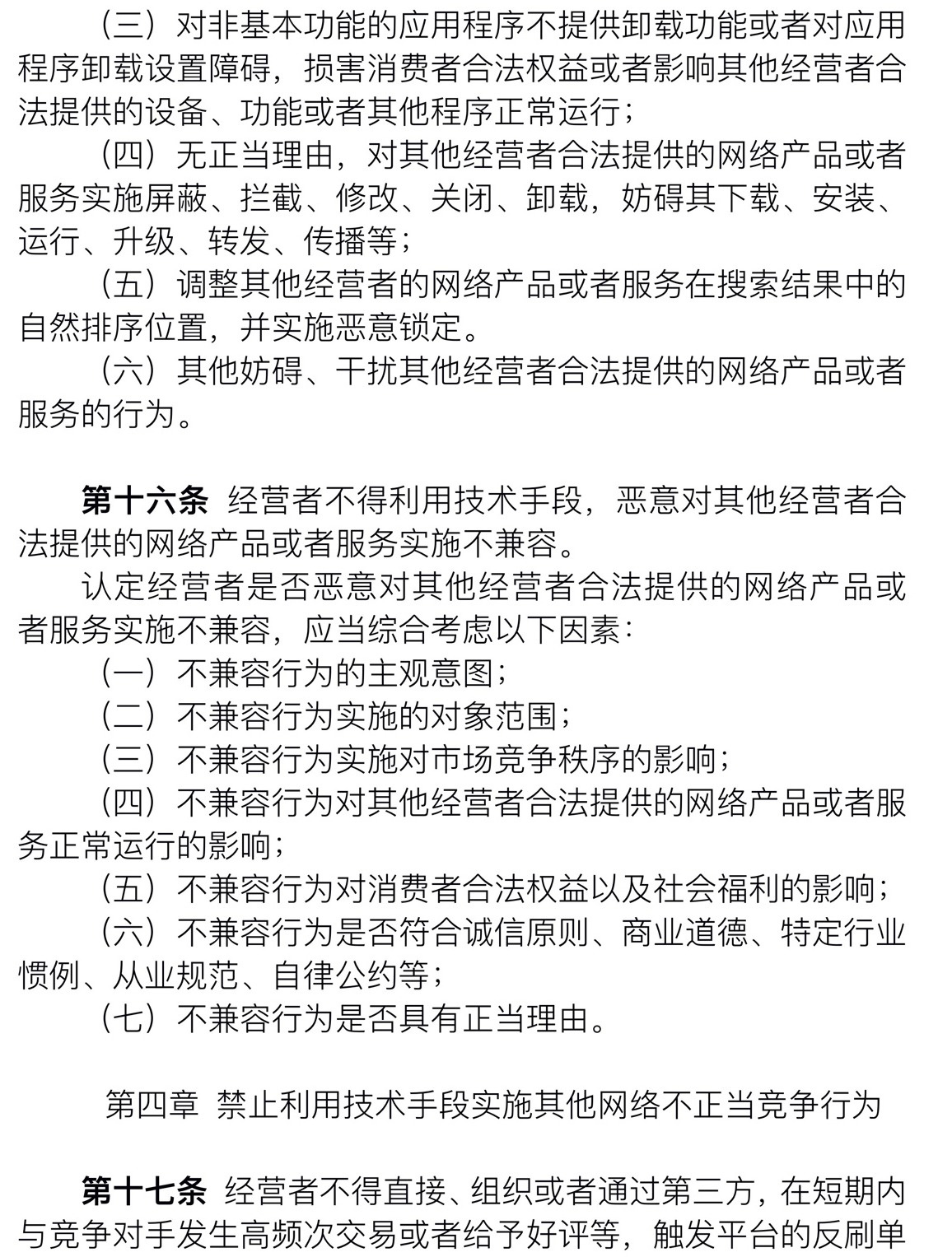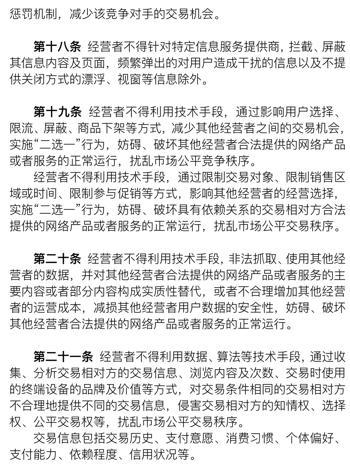 市場監(jiān)管總局還強(qiáng)調(diào),經(jīng)營者不得利用技術(shù)手段,通過影響用戶選擇、限流、屏蔽、商品下架等方式,減少其他經(jīng)營者之間的交易機(jī)會,實(shí)施“二選一”行為,妨礙、破壞其他經(jīng)營者合法提供的網(wǎng)絡(luò)產(chǎn)品或者服務(wù)的正常運(yùn)行,擾亂市場公平競爭秩序。