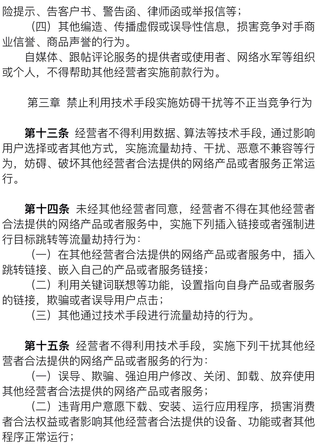 《規(guī)定》中提出,經(jīng)營者不得利用數(shù)據(jù)、算法等技術(shù)手段,通過影響用戶選擇或者其他方式,實(shí)施流量劫持、干擾、惡意不兼容等行為,妨礙、破壞其他經(jīng)營者合法提供的網(wǎng)絡(luò)產(chǎn)品或者服務(wù)正常運(yùn)行。