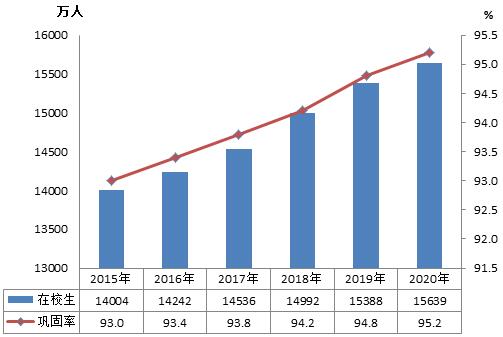 全國共有義務(wù)教育階段學(xué)校21.08萬所,招生3440.19萬人,在校生1.56億人,專任教師1029.49萬人,九年義務(wù)教育鞏固率[5] 95.2%。
