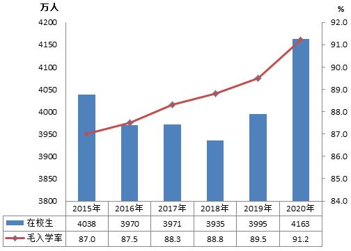 [4]毛入學(xué)率,是指某一級教育不分年齡的在校學(xué)生總數(shù)占該級教育國家規(guī)定年齡組人口數(shù)的百分比。由于包含非正規(guī)年齡組(低齡或超齡)學(xué)生,毛入學(xué)率可能會超過100%。