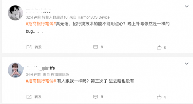 2021-10-17 20:52:54閱讀()互聯(lián)網(wǎng)10月17日消息,據(jù)多名網(wǎng)友在微博發(fā)文反映,在昨日招商銀行筆試過程中,考試系統(tǒng)多次崩潰,出現(xiàn)亂碼情況、重啟電腦導(dǎo)致考試中斷,參加補(bǔ)考仍然出現(xiàn) bug 等等。