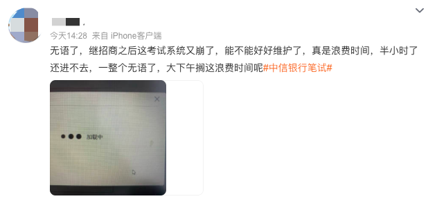 10月22日下午,大量網(wǎng)友在微博發(fā)文稱(chēng)自己在參加中信銀行校招在線(xiàn)筆試時(shí)考試系統(tǒng)崩了。