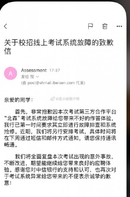 也有網(wǎng)友曬出了收到的中信銀行校招線(xiàn)上考試系統(tǒng)提供方北森發(fā)來(lái)的致歉信。