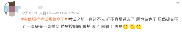 有網(wǎng)友稱(chēng),進(jìn)就進(jìn)了半個(gè)小時(shí),剛答完第一部分又提交不了。也有網(wǎng)友吐槽,中信銀行的筆試真的逼瘋我,一開(kāi)始是考試進(jìn)不去,現(xiàn)在是做完提交不了。而且好像答案不能自動(dòng)保存,心態(tài)崩了……