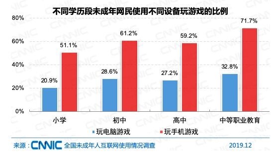 不同學(xué)歷段對(duì)比發(fā)現(xiàn),雖然小學(xué)生網(wǎng)民使用電腦和手機(jī)玩游戲的比例為各學(xué)歷段最低,但依然達(dá)到20.9%和51.9%;初中生網(wǎng)民使用電腦和手機(jī)玩游戲的比例分別為28.6%和61.2%,高中生由于學(xué)業(yè)壓力更大,玩游戲比例反而比初中生要略低一些。