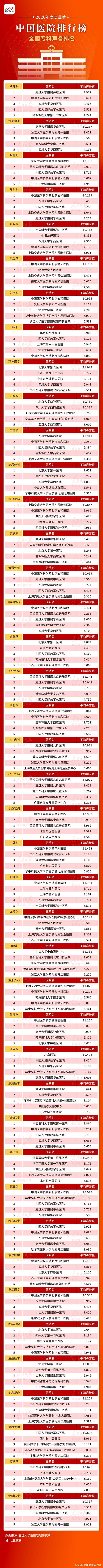 2021-11-21 23:49:15閱讀()人民日報(健康時報記者 尹薇 復(fù)旦大學(xué)醫(yī)院管理研究所 孫國根)11月20日下午,復(fù)旦大學(xué)醫(yī)院管理研究所在上海發(fā)布復(fù)旦版《2020年度中國醫(yī)院綜合排行榜》和《2020年度中國醫(yī)院專科聲譽排行榜》。全國共有100家醫(yī)院進(jìn)入“復(fù)旦版中國醫(yī)院綜合排行榜”,??坡曌u排行榜中設(shè)置了42個???。這是復(fù)旦大學(xué)醫(yī)院管理研究所作為獨立第三方連續(xù)第十二年發(fā)布醫(yī)院排行榜。