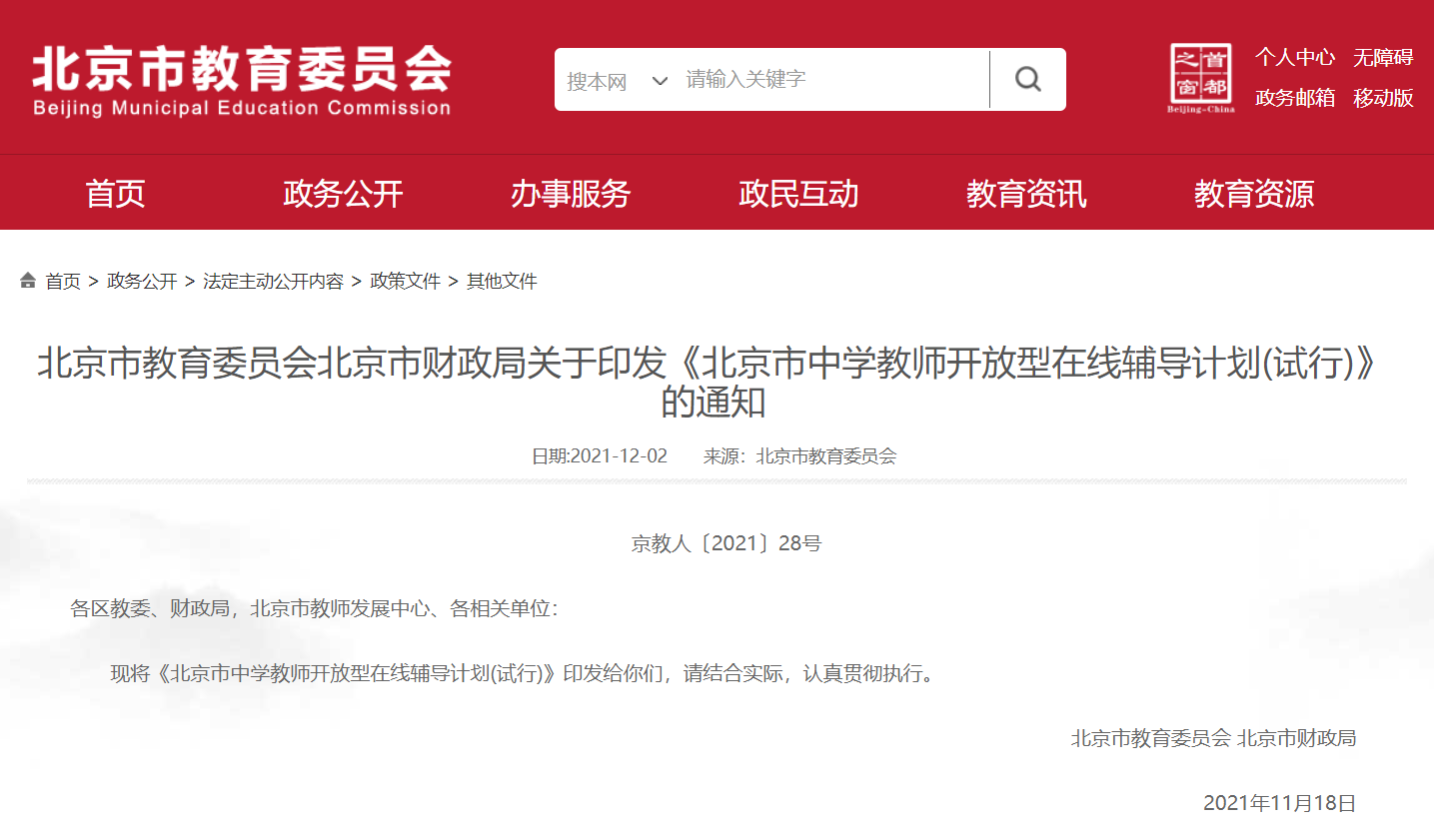 2021-12-04 17:48:41閱讀()互聯(lián)網(wǎng)12月3日消息,北京市教育委員會12月2日公布北京市教育委員會、北京市財政局關(guān)于印發(fā)《北京市中學(xué)教師開放型在線輔導(dǎo)計劃 (試行)》(下稱《計劃》)的通知。