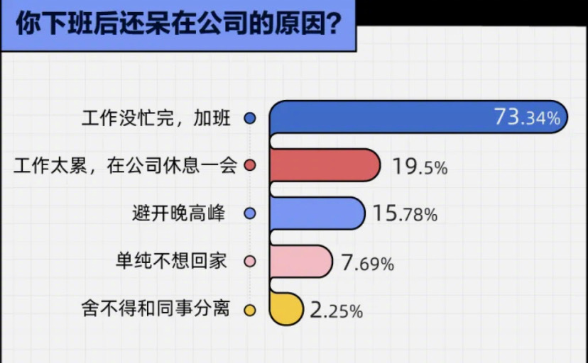 不過也有網(wǎng)友稱,自己曾經(jīng)都是活干完了到點就下班,但有同事曾私下跟他說下班以后多在公司留半個小時一個小時再走,下班就走領(lǐng)導(dǎo)看見了不好。