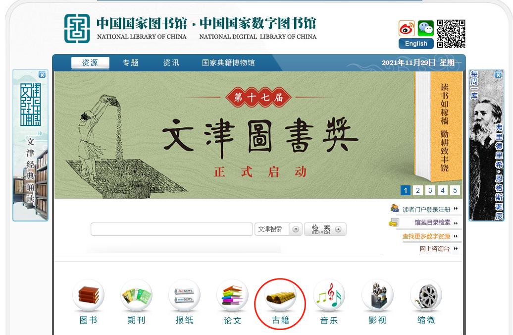 1.在國家圖書館主頁面,選擇“資源”選項,點擊“古籍”。
