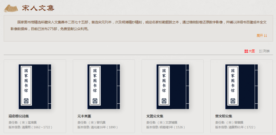 國家圖書館精選所藏宋人文集善本 275 部,首選宋元刊本,次及明清精抄精刻,或經(jīng)名家校勘題跋之本,通過縮微膠卷還原數(shù)字影像,并輔以詳細(xì)書目建成本全文影像數(shù)據(jù)庫,免費呈獻(xiàn)公眾利用。