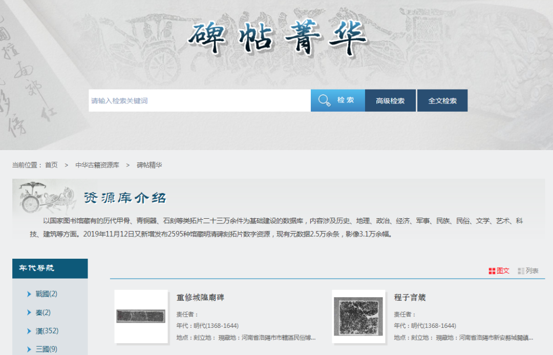該資源庫以國家圖書館藏有的歷代甲骨、青銅器、石刻等類拓片二十三萬余件為基礎(chǔ)建設(shè),內(nèi)容涉及歷史、地理、政治、經(jīng)濟(jì)、軍事、民族、民俗、文學(xué)、藝術(shù)、科技、建筑等方面。2019 年 11 月 12 日又新增發(fā)布 2595 種館藏明清碑刻拓片數(shù)字資源,現(xiàn)有元數(shù)據(jù) 2.6 萬余條,影像 3.1 萬余幅。
