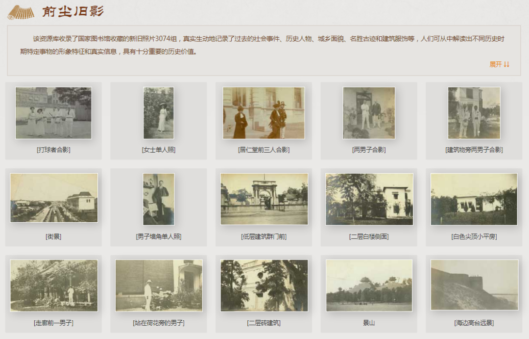 該資源庫收錄了國家圖書館收藏的新舊照片 3074 組,真實生動地記錄了過去的社會事件、歷史人物、城鄉(xiāng)面貌、名勝古跡和建筑服飾等,人們可從中解讀出不同歷史時期特定事物的形象特征和真實信息,具有十分重要的歷史價值。