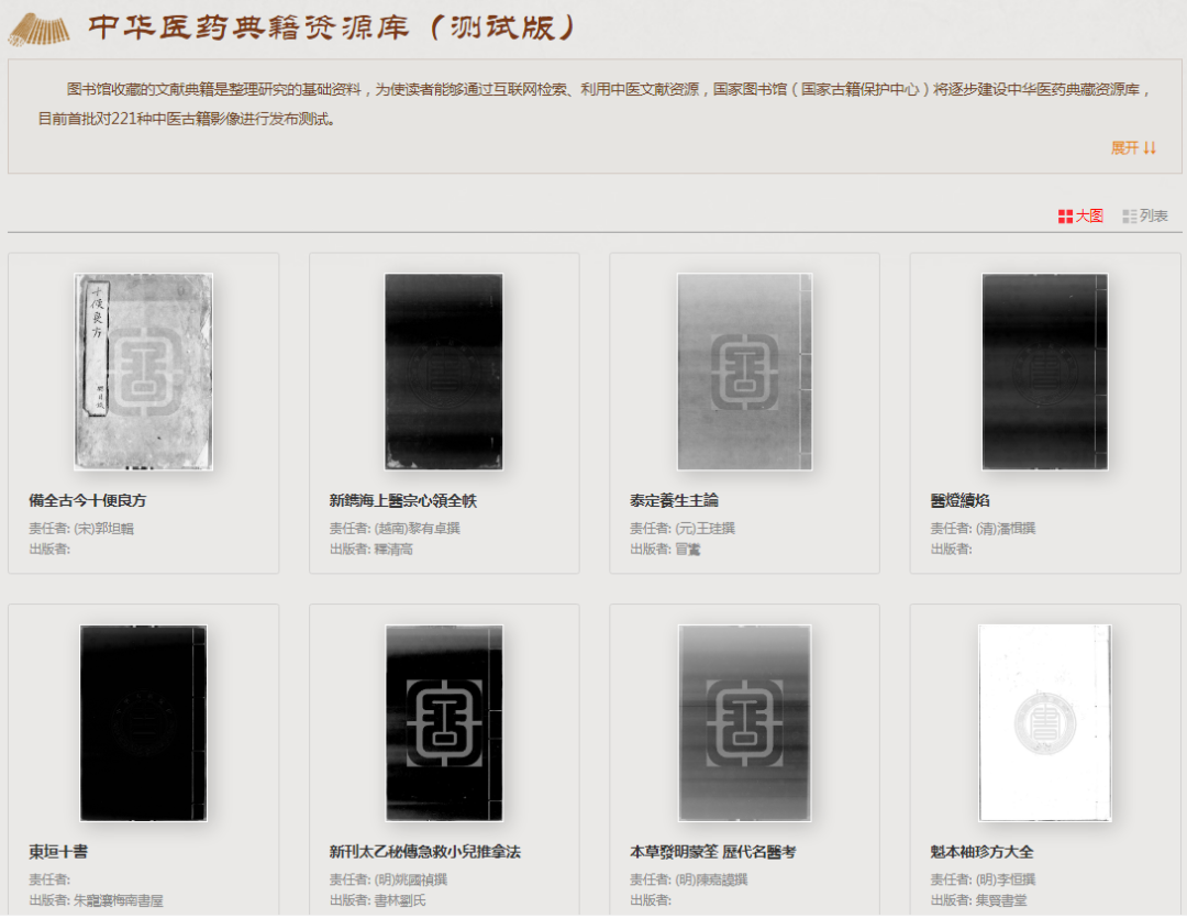 圖書館收藏的文獻(xiàn)典籍是整理研究的基礎(chǔ)資料,為使讀者能夠通過互聯(lián)網(wǎng)檢索、利用中醫(yī)文獻(xiàn)資源,國家圖書館(國家古籍保護(hù)中心)將逐步建設(shè)中華醫(yī)藥典藏資源庫,目前首批對 221 種中醫(yī)古籍影像進(jìn)行發(fā)布測試。