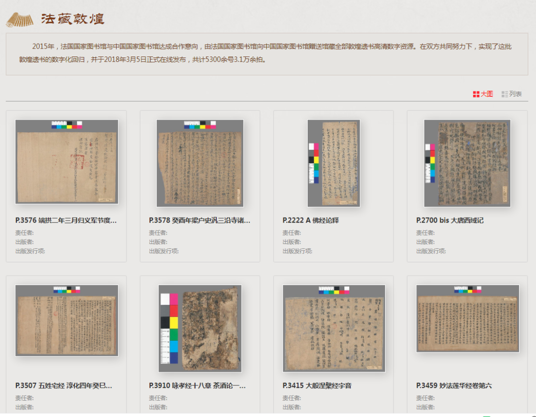 2015 年,法國國家圖書館與中國國家圖書館達(dá)成合作意向,由法國國家圖書館向中國國家圖書館贈送館藏全部敦煌遺書高清數(shù)字資源。在雙方共同努力下,實現(xiàn)了這批敦煌遺書的數(shù)字化回歸,并于 2018 年 3 月 5 日正式在線發(fā)布,共計 5300 余號 3.1 萬余拍。
