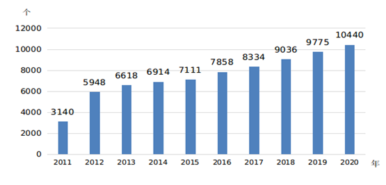 3.殘疾兒童康復(fù)服務(wù)水平顯著提升。《綱要》實(shí)施以來,國(guó)家先后實(shí)施殘疾兒童搶救性康復(fù)項(xiàng)目、殘疾兒童康復(fù)救助制度,目前全國(guó)殘疾兒童康復(fù)救助政策體系、工作體系和服務(wù)網(wǎng)絡(luò)全面建立,為開展殘疾兒童康復(fù)救助提供了有力保障。截至2020年底,全國(guó)開展殘疾兒童康復(fù)的殘疾人康復(fù)機(jī)構(gòu)10440個(gè)(見圖6),比2011年增加7300個(gè)。2020年,全國(guó)共有23.7萬名0—6歲殘疾兒童接受了基本康復(fù)服務(wù),比2016年[6]增加8.7萬人,接受基本康復(fù)服務(wù)的殘疾人中0—6歲殘疾兒童比重為2.2%。
