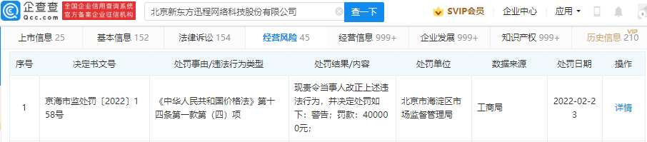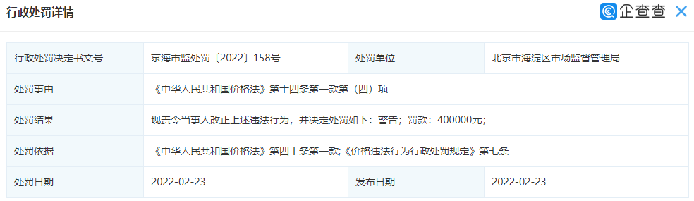 2022-03-01 13:39:54閱讀()互聯(lián)網(wǎng)3月1日消息,信息顯示,近日,北京新東方迅程網(wǎng)絡科技股份有限公司因涉嫌利用虛假或使人誤解的價格手段誘騙消費者交易,被北京市海淀區(qū)市場監(jiān)督管理局罰款40萬元。