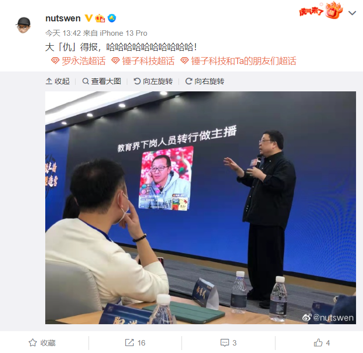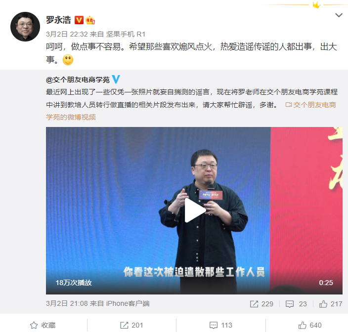 而后,交個朋友電商學(xué)苑微博把相關(guān)的直播視頻片段發(fā)布了出來,羅永浩轉(zhuǎn)發(fā)繼續(xù)表示,“呵呵,做點(diǎn)事不容易。希望那些喜歡煽風(fēng)點(diǎn)火,熱愛造謠傳謠的人都出事,出大事。”