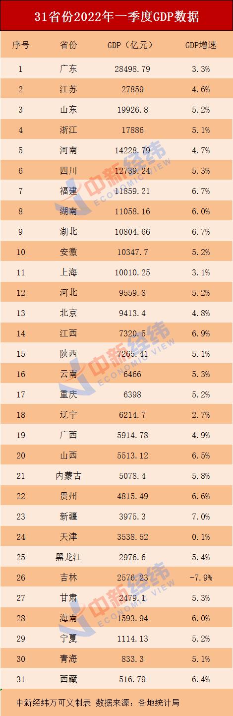 2022年31省份一季度GDP排名:粵蘇魯居前3
