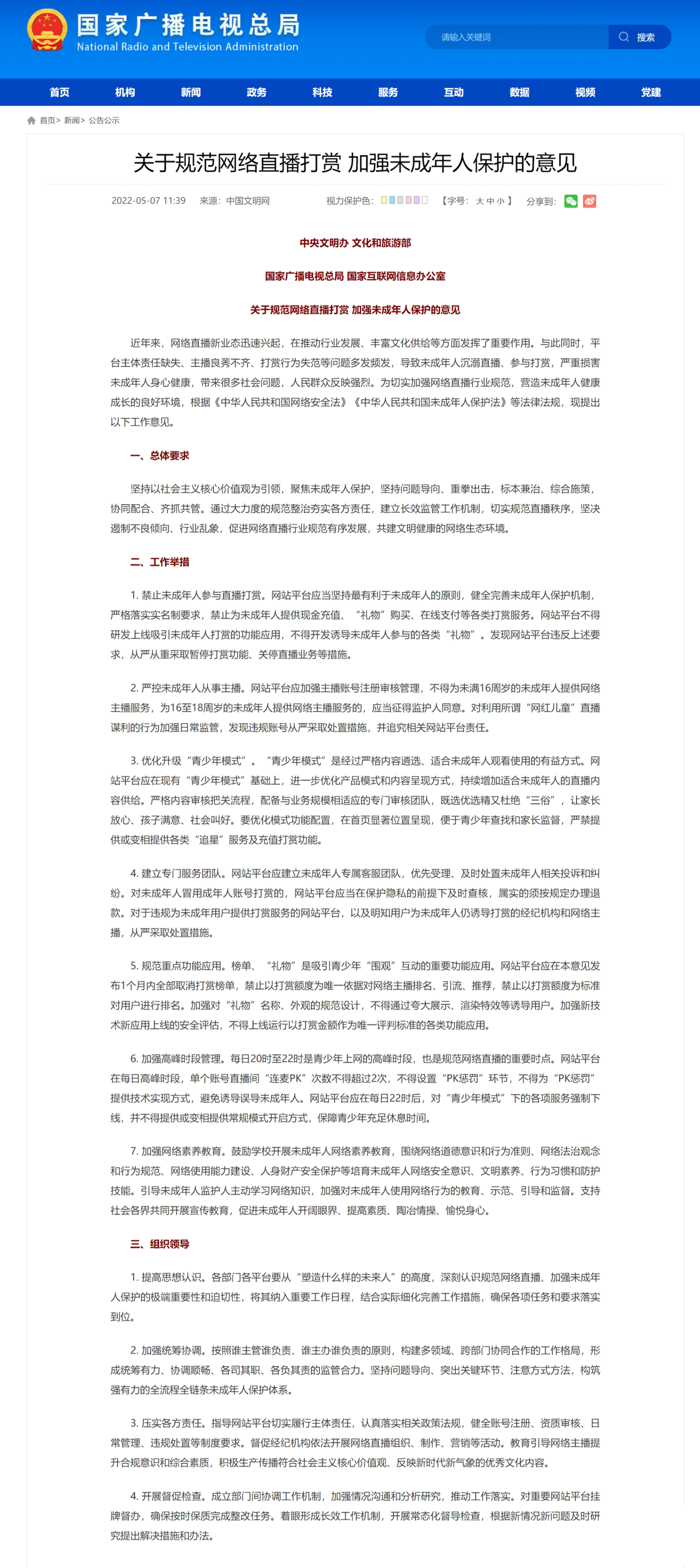 2022-05-07 23:39:22閱讀()國家廣電總局5月7日消息,據(jù)國家廣播電視總局網(wǎng)站,中央文明辦、文化和旅游部、國家廣播電視總局、國家互聯(lián)網(wǎng)信息辦公室發(fā)布了《關(guān)于規(guī)范網(wǎng)絡(luò)直播打賞加強(qiáng)未成年人保護(hù)的意見》(以下簡(jiǎn)稱《意見》)。