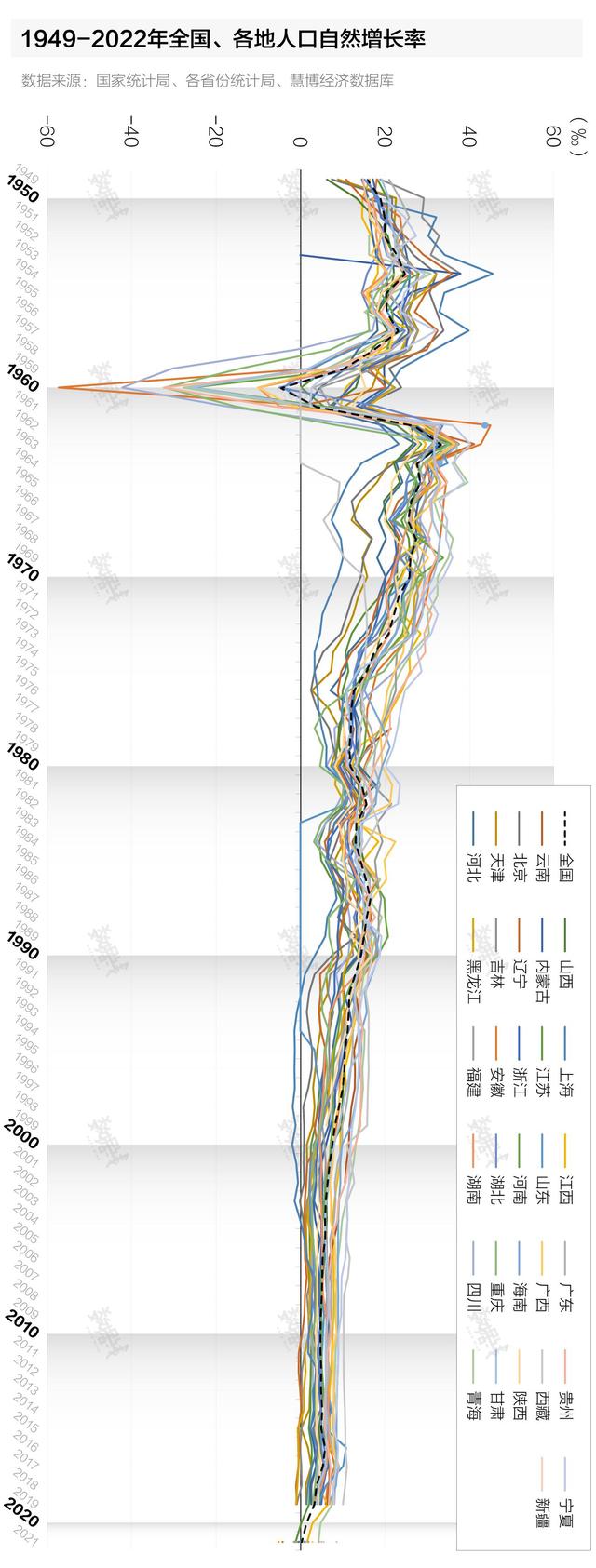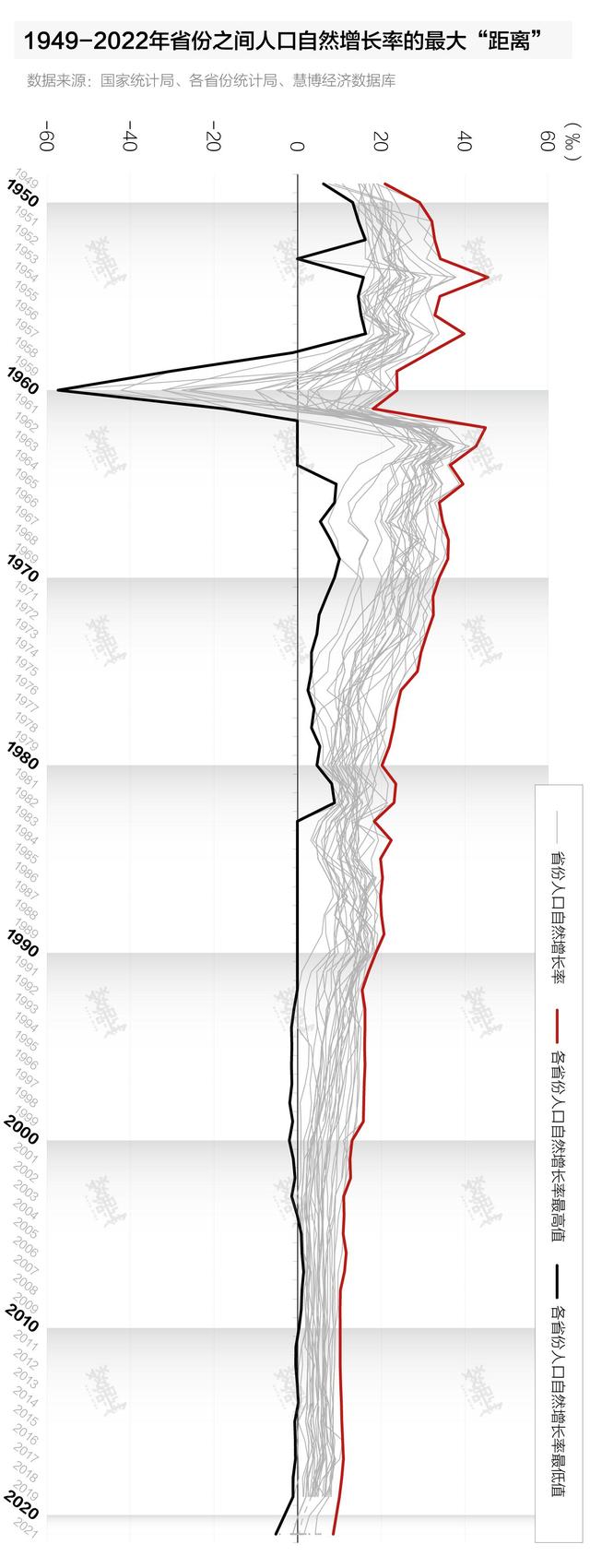界面數(shù)據(jù)進(jìn)一步統(tǒng)計(jì)后發(fā)現(xiàn),1960年以來,各省份之間人口自然增長率的跌勢在趨緩、“差距”在縮小。