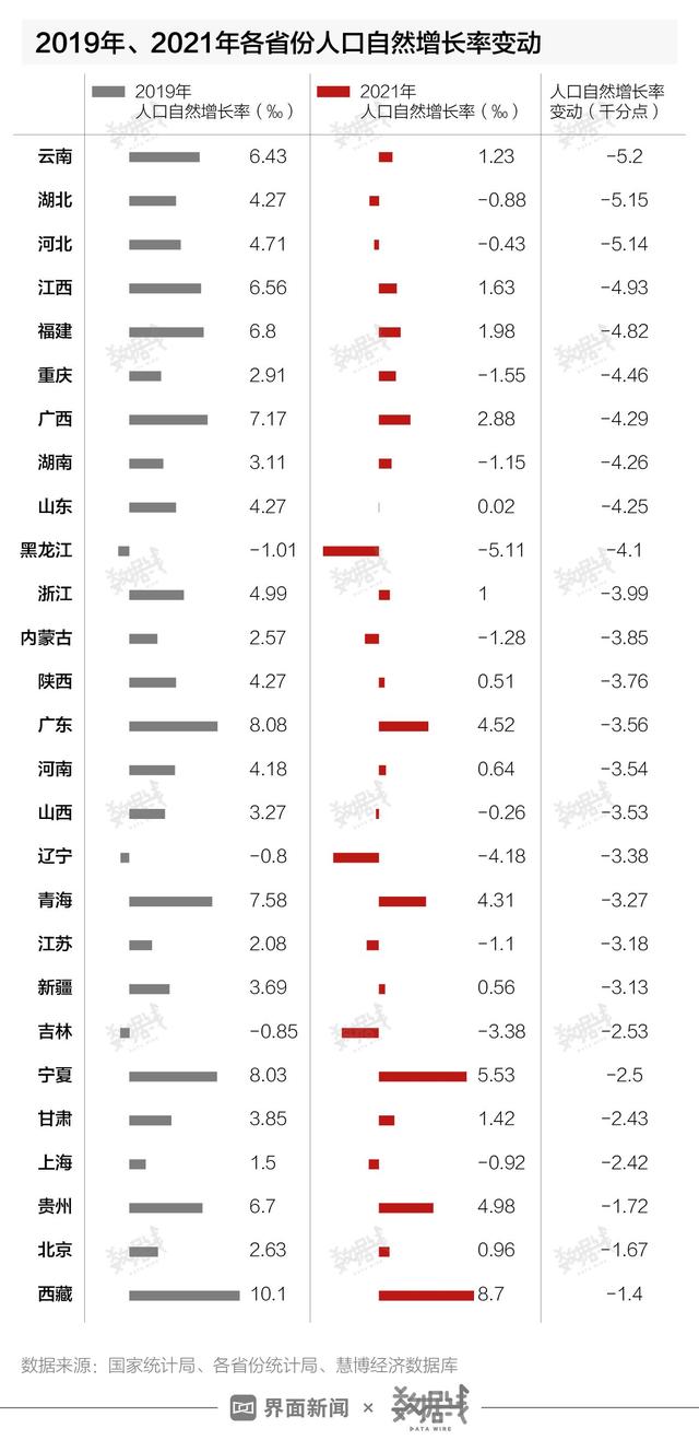 分各省份來看,據(jù)界面數(shù)據(jù)測算,在有人口自然增長率可查的27個省份中,以2019年數(shù)據(jù)為基準(zhǔn)線(2020年僅3個省份公布了人口自然率數(shù)據(jù)),2021年,人口自然增長率下降最大的3個省份是云南、湖北、河北,跌幅超5個千分點(diǎn)。
