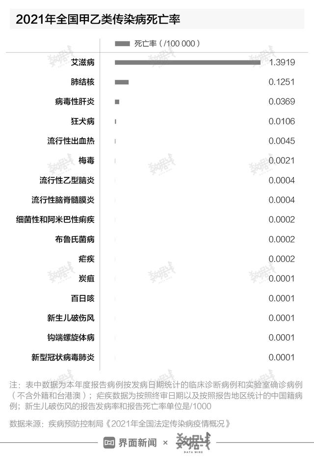 與其他傳染病相比,0.0001/10萬的死亡率處在何種水平?2021年,全國法定傳染病的死亡率為1.81/10萬。在16種有死亡率公布的甲乙類傳染病中,死亡率為0.0001/10萬的新冠肺炎,與炭疽、百日咳等4類傳染病并列倒數(shù)第一。排在首位的的艾滋病,死亡率為1.3919/10萬。