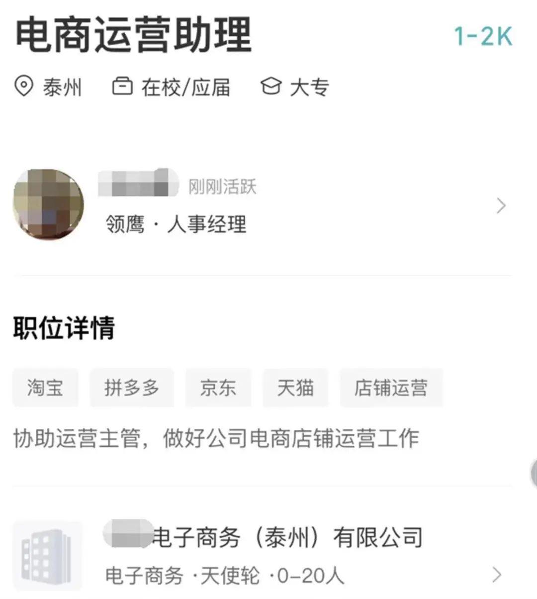 網(wǎng)傳截圖顯示,江蘇泰州一公司正在招募電商運(yùn)營助理。招聘詳情稱,公司創(chuàng)新目前招募兩個(gè)崗位:一個(gè)是客服崗位,一個(gè)是運(yùn)營崗位。