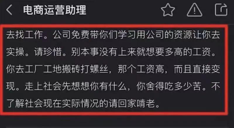 值得注意的是,該職位詳情一欄介紹:“想做運(yùn)營崗位又沒本事的朋友第一個(gè)月800元工資,不要覺得少,請放下姿態(tài),別本事沒有上來就想要多高的工資。”該招聘信息中還提到:“走上社會(huì)先想想你有什么,不了解社會(huì)現(xiàn)在實(shí)際情況的請回家啃老”。