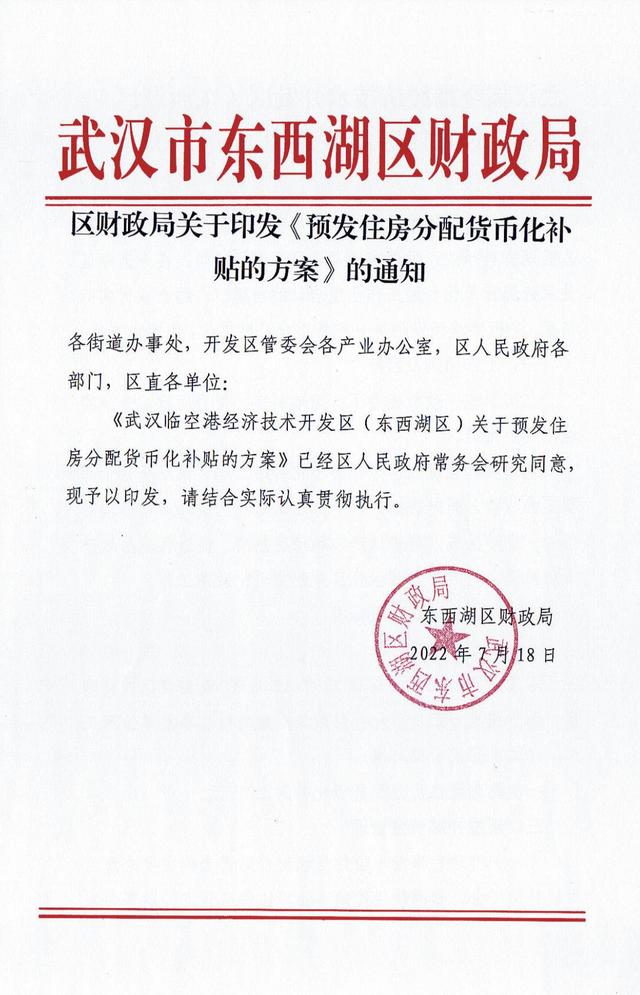 2022-07-25 17:50:21閱讀()互聯(lián)網(wǎng)7月18日,武漢市東西湖區(qū)財(cái)政局印發(fā)《預(yù)發(fā)住房分配貨幣化補(bǔ)貼的方案》的通知,稱將向符合條件的行政事業(yè)單位購(gòu)房職工一次性預(yù)發(fā)補(bǔ)貼15萬(wàn)元。對(duì)此,武漢市東西湖區(qū)財(cái)政局一位工作人員表示,這部分補(bǔ)貼為預(yù)發(fā)放,未來(lái)5年內(nèi)會(huì)從收入中進(jìn)行扣除。